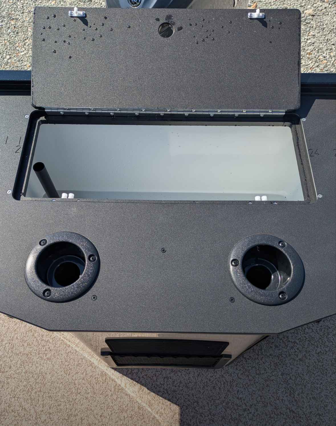 - Additional Features: The boat includes a black bimini and a Garmin Striker 5CV fish finder. Other features and options can include a trolling motor harness, hydraulic cylinder deduct, and a Powertech stainless steel propeller. The model also features two-tone fence panels and powder-coated rails.